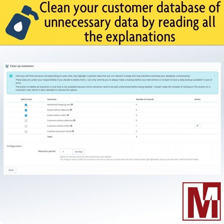 The module integrates precise and explained scenarios to allow you to make the right decisions to schedule with cron tasks some of the scenarios or simply to launch them manually when you need them.